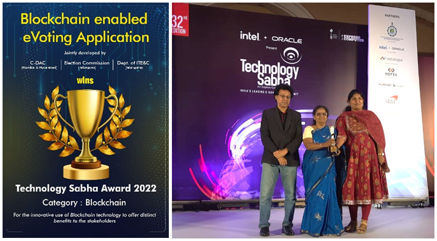 The “Blockchain enabled eVoting application” has bagged the “Technology Sabha Award 2022” under the “Blockchain” category, for the innovative use of Blockchain technology to offer distinct benefits to the stakeholders in Telangana.