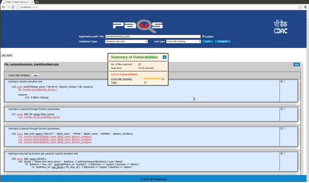 PAVS is a static source code analyser tool for scanning vulnerabilities in PHP web applications. This targets cross-site scripting, SQL injection, file manipulation, command injection and code evaluation related vulnerabilities in PHP based web applications. And it checks these vulnerabilities against user input & file and database related functions. And it also checks the loop holes in PHP configuration file. A detailed report on the vulnerabilities present in the source code is generated in the PDF format.
