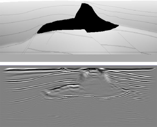 SeisKDM: 2D velocity model of salt extracted from 3D SEG/EAGE Salt data and corresponding SeisKDM outcome.