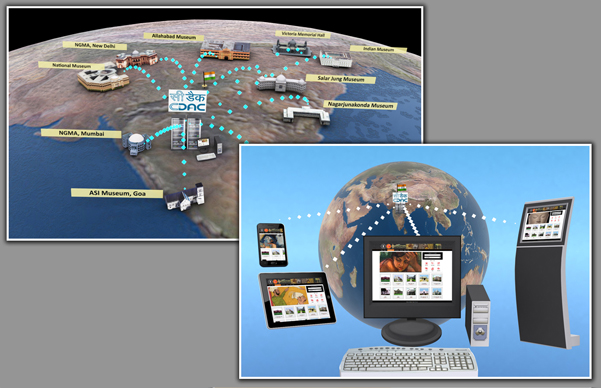 The National Portal and Digital Repository for Museums of India are designed and developed by Human-Centred Design and Computing Group, C-DAC, Pune. It provides an all pervasive and integrated access to theme based collections and artefacts irrespective of the physical and geographical locations of museums. The portal introduces India's rich heritage through a diverse range of digital collections in terms of sculptures, paintings, manuscripts, weapons, coins and a numerous other categories of artefacts. The virtual museums are a wealth of knowledge accessible from anywhere and at anytime for students, teachers, researchers and even the tourists. It is perhaps for the first time in world that 10 national museums are made accessible online from one portal. This project is funded by Ministry of Culture, Government of India. The digital collections created using the JATAN: Virtual Museum Builder are integrated in the national digital repository for giving public access through the national portal.