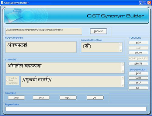 This tool is designed for building a large database of synonyms for respective headwords. The Gist-Synonym Builder Tool is a good way to digitalize and store synonym data. The Encoding for the stored data is UNICODE. Rarely used synonyms can be added for head word. Also Grammatical information can be preserved for head word.