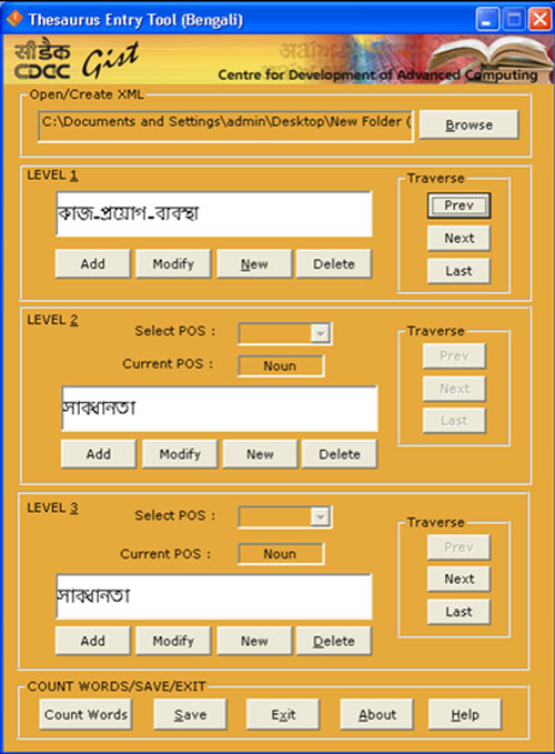 Also Thesauri exist for Hindi, Gujarati. Thesauri for Telugu with the 56579 words and for Bengali having words 76223 has been entered using this tool. A Thesaurus GUI can be used for focused search in Search Engines. Other areas of applications are essential plug-ins for search engines, learning tools, e-governance, word net, semantic web and prediction dictionaries to name a few major areas.