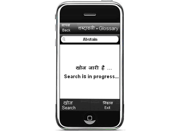 Applied AI group, C-DAC is also working on the mobile based glossaries on WAP as well as standalone applications. Some prototype applications have been developed. The facilities like bidirectional search Hindi-English, pronunciation of the words/phrases and Hindi typing are implemented. Using these glossaries user can fetch the meaning of the respective language on mobile screen and can hear the pronunciation of word at the same time.