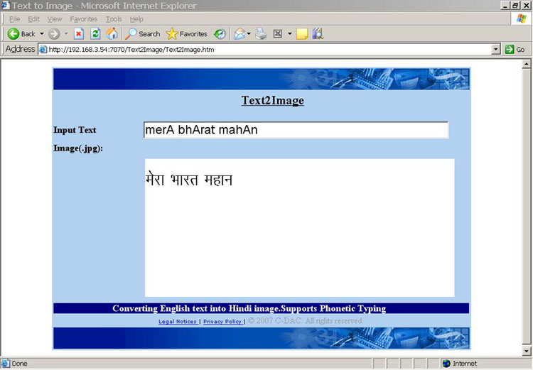 This utility converts the input Indian language data to an image. The advantage of this utility is one can create an image of the Indian Language data and can send it as an email for the client to read or send it to any system or device capable of showing the image. And being an image, no font is required to be present on the receiving system.