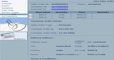 This sub module is responsible for performing all sales related activities. Every sales activity starts from customer inquiry and ends with delivery. The sales Order management has following functions: enquiry handling, quotation preparation, monitoring sales transaction, Making a request to manufacturing department about the goods to be manufactured, scheduling the delivery of goods.