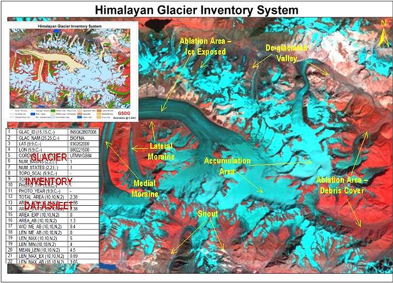 - Generation of Glacier inventory data sheet, which provides glacier-wise details mainly related to the glacier identification in terms of number and name, location, elevation, dimensions, orientation, etc.