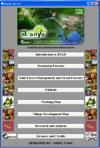 A module based SDSS named 'Aranya' has been developed using open source technology (mainly QGIS) for forest department Bodoland Territorial Areas District (BTAD), Assam, which facilitates the decision making in different domains of forestry, including protection, monitoring, management, research and planning, where each module broadly correspond to administrative working section of the forest departments in India, such as Territorial, Working Plan, Biodiversity, Wildlife, Research, Carbon calculator etc. It also has provision to carry out carbon pool inventory and land allocation planning for rehabilitation.